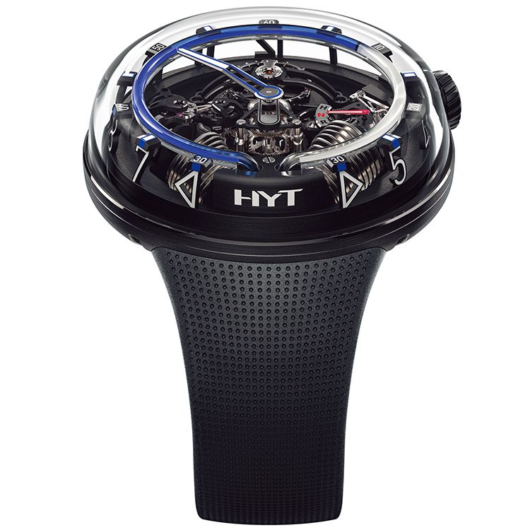 時計の技術革新は、時刻表示方式にも向けられる。これは、文字盤外周に極細のチューブを備え、その内部を満たす青と透明の2種類の液体の境目が時針代わりに時を指し、中心の針が分を表示する。内蔵する技術は、機械式手巻きムーブメントの機構原理をベースに、歯車の回転運動をピストンの直線運動に転換し、文字盤下部にV字に設けた2つのふいごを動作させる。