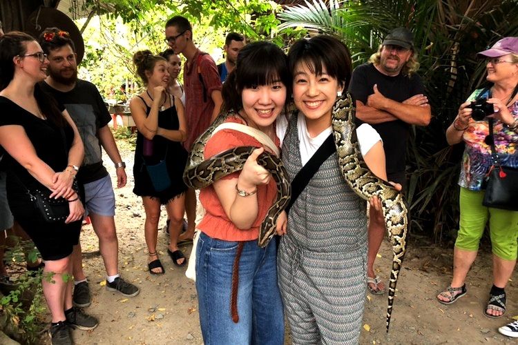 大蛇にも巻きつかれても笑顔を絶やさない真里花さん。「メコン川の支流をボートで下るツアーで、蛇を含めてトータルで6000円ぐらいでした。すごく楽しかったですね」