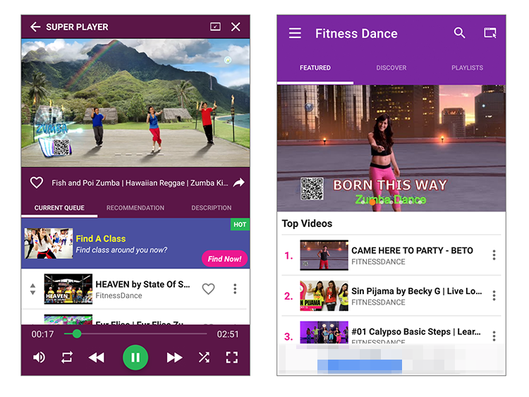 Youtubeで公開されているズンバのプログラム動画を流用しているため、利用時にはネット接続が必須。パケット容量が気になるなら、Wi-Fi環境での利用がオススメだ。ダンス系フィットネスのなかでも、全身を鍛えるほか心肺機能強化の効果も期待できるということで特に人気が高い「ズンバ」の指導動画を集めた、まとめアプリのような構造になっているこのアプリ。あらかじめリストアップされたオススメのメニューはもちろん、自分で目当ての動画を検索することもできるようになっている。