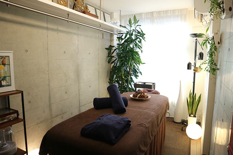 部屋に入った瞬間、オイルの香りが鼻をくすぐる。部屋の中心にベッドが一台置かれたプライベート空間は清潔感に包まれていた。ここは、日本ではまだ珍しいアーユルヴェーダの施術がマンツーマンで受けられるサロンである。