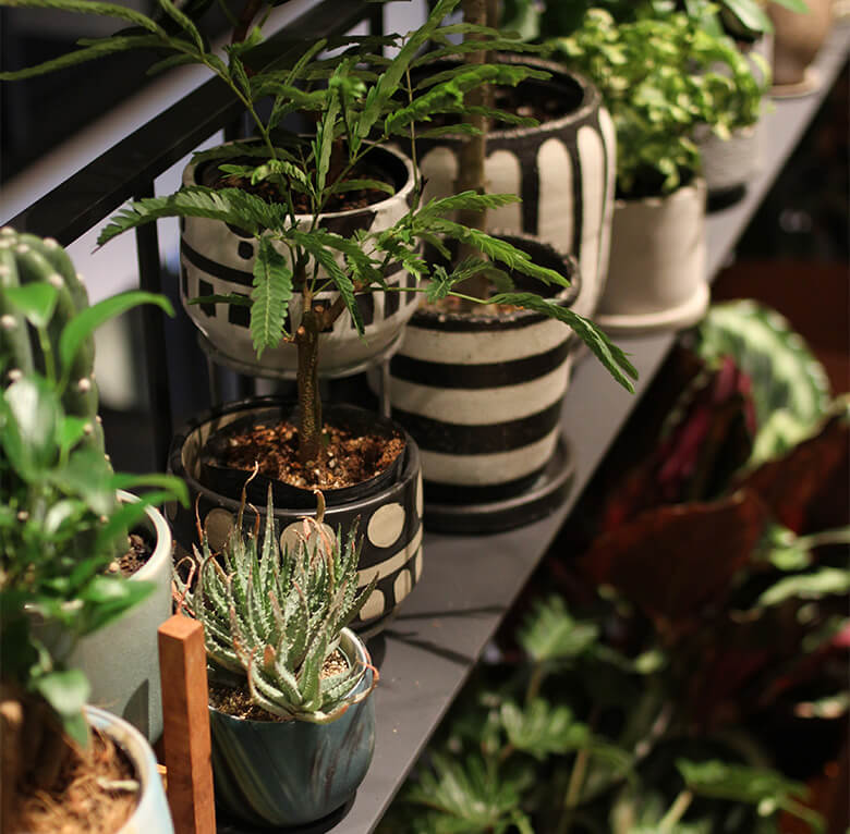 多種多様なグリーンで埋め尽くされるナーセリー。そのバラエティに富んだ見たこともないグリーンの品揃えは、さながら小さな植物園のよう。