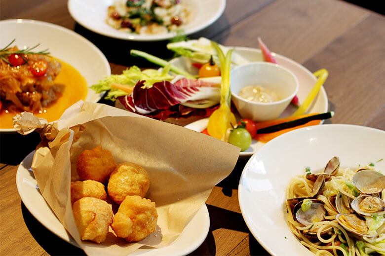 地元産食材にこだわった豊富なランチメニュー。広々とした2階のショップフロアには、アパレルからアイウェア、アクセサリー、そしてスキンケアやランドリーグッズなど、さまざまな角度から物欲が刺激されるアイテムが並び、緑の借景を眺めながらゆっくりと見て回ることができる。