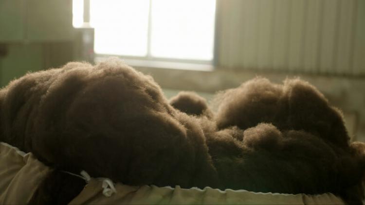 刈り取ったばかりのヤクの毛。絶妙な色味がよくわかる。「このニットは、ヤクそのものの毛の色を活かしています。ベージュのようで、茶色のようで、グレーっぽくもある。こんな微妙な色は、人工的に出そうと思っても表現できないですよね」。