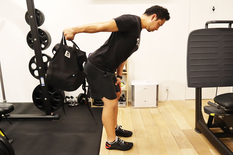 「その状態から、バッグを引き上げましょう。肘は体に沿うように後ろへ引いていき、肩甲骨部分が背骨側に寄っていくような感覚が正解です」。