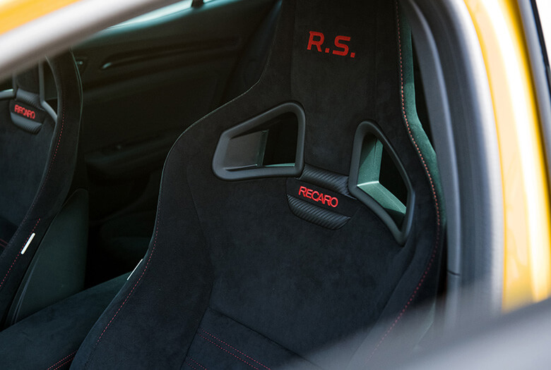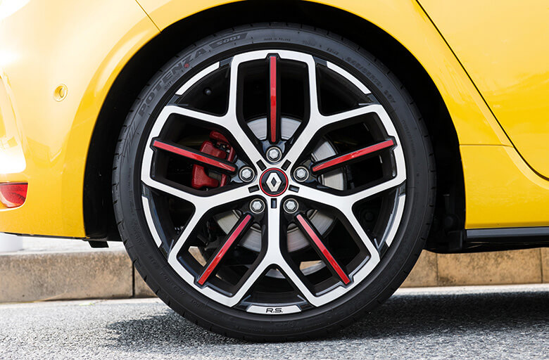 19インチホイールのデザインはルノーのスポーツブランドの頂点を示すコンセプトカー「ルノー・スポール R.S. 01」からインスパイアされている。そこから覗く赤いブレーキキャリパーは車のパワーを受け止めるためのブレンボ社製。特に荷重のかかるフロントは、軽量で冷却性能も高いスリット入りの専用品が備わる。