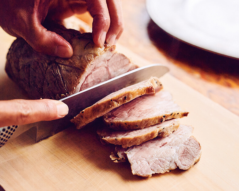 4の豚肉を好みの厚さに切って、5の里芋やベビーリーフなど(分量外)と器に盛る。豚肉に6のソースをかけていただく。