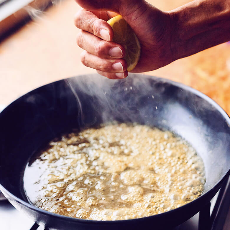 フライパンに肉汁とはちみつにバター、そして……。火を消して、レモン汁を加えて混ぜ、ソースの完成。