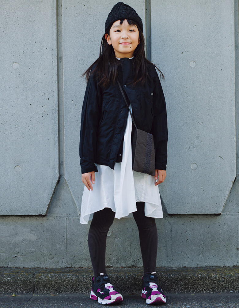 KEYWORD[モノトーン]高野心花ちゃん Age 9黒と白のコントラストを素材使いで際立たせながら、足元でハズす上級テク。お見それしました〜。