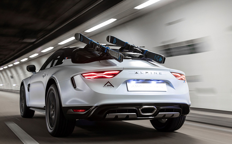 アタッチメントをカスタムすれば、スキー板だけでなくサーフボードや自転車なども搭載できそうだ。パワートレインはスポーツカーA110のピュアグレードと同じ。252ps/320Nmの動力性能はそのままに直噴1.8L直列4気筒ターボエンジンをミッドシップに納め、後輪を駆動する。
