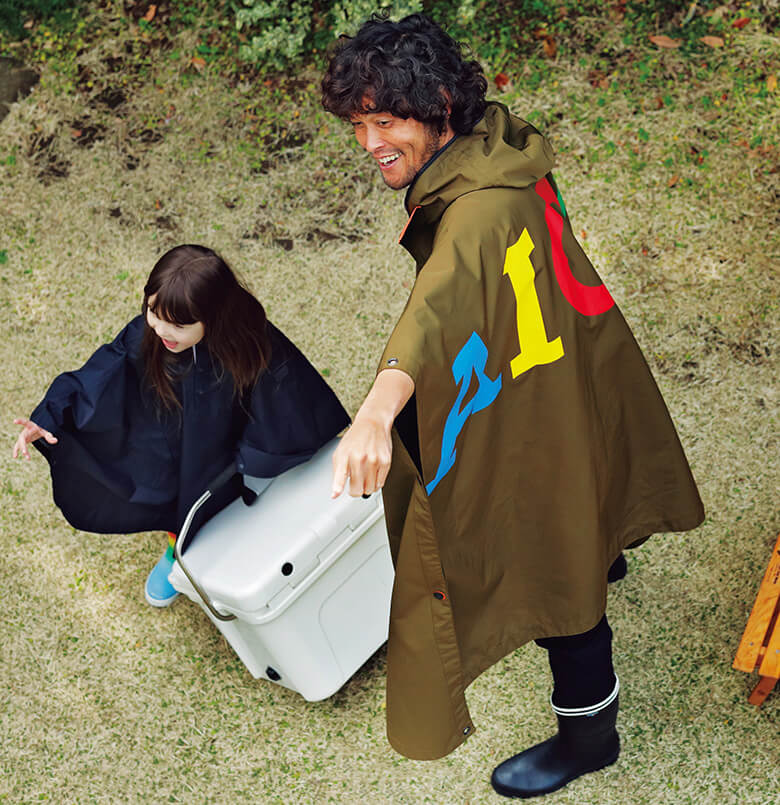 [男性]ポンチョ4万9000円、Tシャツ4300円、パンツ1万5000円、ハット7900円、ブーツ1万4000円/すべてエーグル 0120-810-378 [子供]ポンチョ1万5000円、ブーツ5500円/ともにエーグル 0120-810-378広げれば、タープに早変わり! 生活を豊かにする斬新な発想ビビッドなカラーのロゴ使いは当然アガるのだが、このポンチョの魅力はそれだけではない。脇のスナップボタンを外して広げ、ポールを利用して立てることで、タープやシェルターなどとしても使える優れものなのだ。