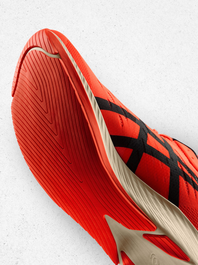 まずはミッドソールを見てみよう。シューズ前足部の特徴的な反り返りは、アシックスのガイドソール・テクノロジーに由来。エネルギー消費を軽減し、効率の良い走りをアシストしてくれる。