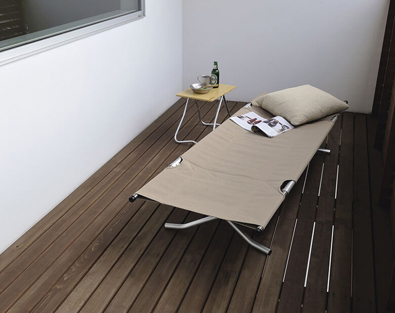 折りたためばこのコンパクトっぷり。いわば携帯できる簡易ベッドは重さ6kg。近所のアウトドアスポットまでなら、片手で持ち運べる。しかもベンチとしても丁度よく、家のベランダから公園、キャンプシーンまで、その用途は幅広い。車に常備しておくのもいいかも。