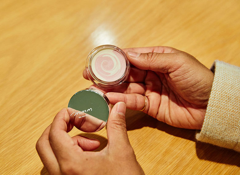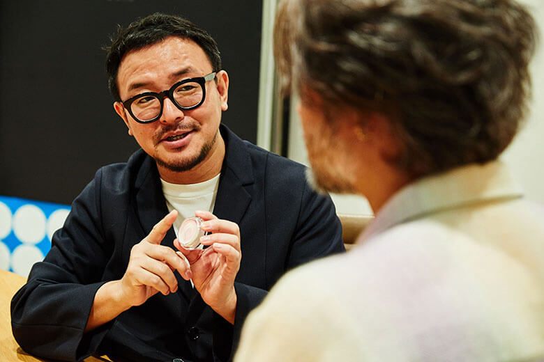 オギ そうそう、「陶器肌」を謳っていて、マットなんだけど透明感がある、っていうね。今日のタネちゃんは最強の肌してるよ。蓋が鏡になってるから、それを使ってチェックしてみて。