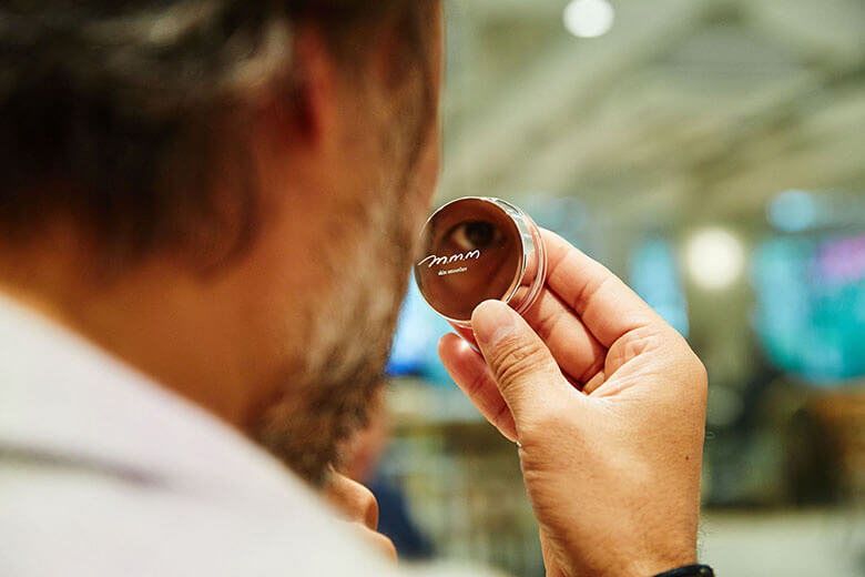 蓋でじーっと肌をチェック。タネ あ、本当だ。拡大鏡みたいになってるんだ。便利だなぁ。