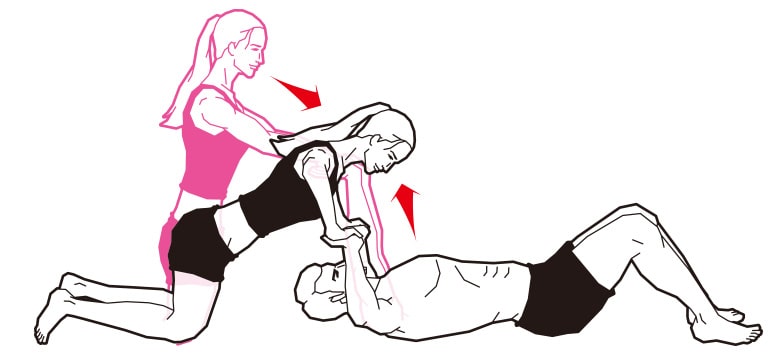 ふたりが向かい合って、鏡のように同じ腹筋運動を繰り返す。まず、互いに両膝を曲げて、両足をしっかり絡み合わせて固定。両腕は頭の後ろで組んでおく。