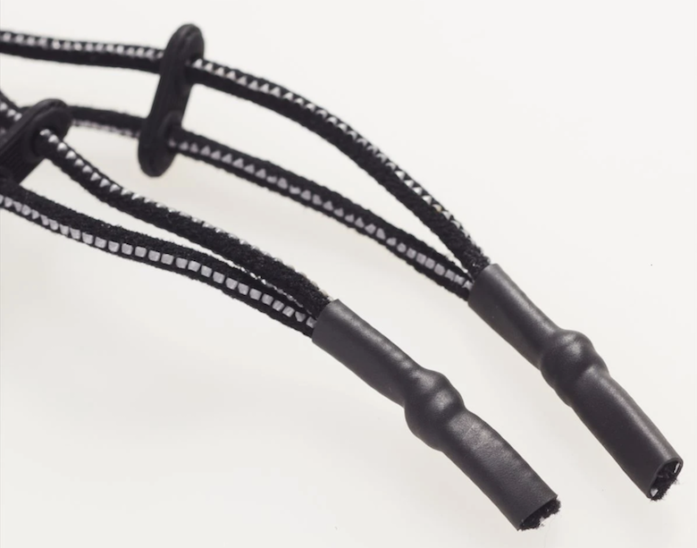 耳ヒモの長さはストッパーパーツで調整できる。一方、マスクの外側は、雨水・泥汚れを防ぐ撥水加工仕様。夜ランなどのアクティビティも考慮し、暗闇でもロゴとヒモ部分が光るリフレクター機能も盛り込んだ。耳ヒモの長さはシリコンストッパーパーツで調整可能である。