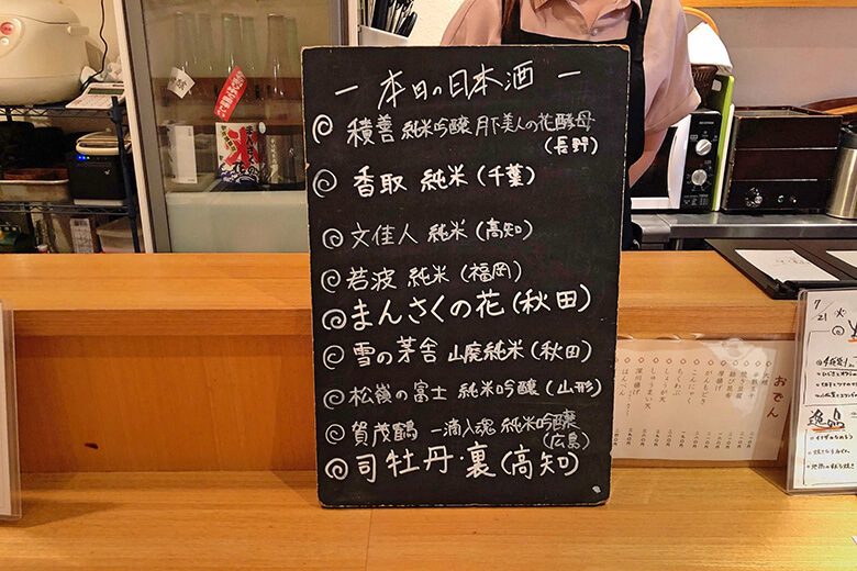 「純米酒を中心に、常時8〜10種類を置いています。お料理がさっぱりめなので日本酒はがっつり純米が合うんです」。