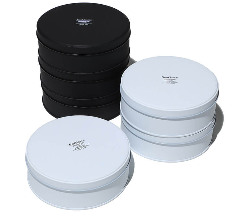 缶は白黒の2色展開。それを収納している缶にもこだわりがある。蓋は、ひっくり返せば蚊取り線香の台として使えるうえに、底にピタリとはまってスタッキングできるので、収納にも便利だ。