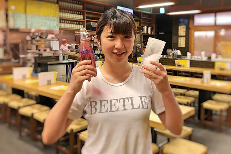 「お待たせしました〜」。シャリキン焼酎を運んできてくれたのは、福島県南部の港町・小名浜出身の佳央梨さん(23歳)。1年半ほど前から、この店でアルバイトをしている。