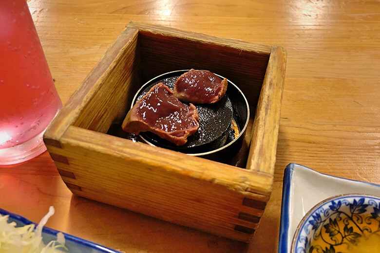 料理は人気ツートップを注文。分厚さに驚かされる「ハムカツ」と朝挽きの「レバテキ」はともに390円。枡に入っているのは焼き石。熱々の石の上にレバーを置くと、すぐに火が通る。これがやたらと楽しい。