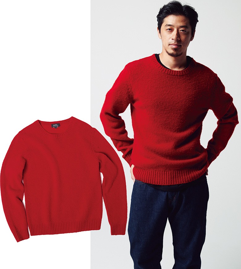 ニット2万9000円/A.P.C. 0120-500-990、Tシャツ6500円、デニム1万6000円/ともにサンセ サンセ(ブランドニュース 03-3797-3673)カラフルな物にも抵抗はないという吉田さん。「であれば思い切って赤でしょう」(梶)と選んできたのがコレ。稀少なラムズウールの柔らかさと発色の良さのおかげで、しっかりインパクトはあるが悪目立ち感はゼロ。