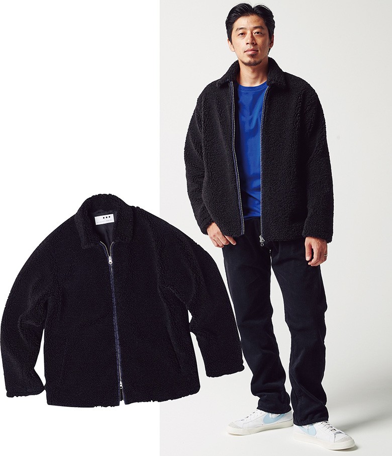 ブルゾン4万5000円/スリードッツ(スリードッツ青山店 03-6805-1704)、Tシャツ1万1000円/A.P.C. 0120-500-990、パンツ1万6000円/サンセ サンセ(ブランドニュース 03-3797-3673)、スニーカー1万1000円/ナイキ(ビリーズエンター 渋谷店 03-5466-2432)「アウトドア畑出身ならこのモコモコに親近感が湧くはず。尖った黒じゃないのがいい」(梶)。黒も普段から親しみがある色だが、そこに最高級エコファーの優しげなタッチという絶妙なスパイスを加えた。