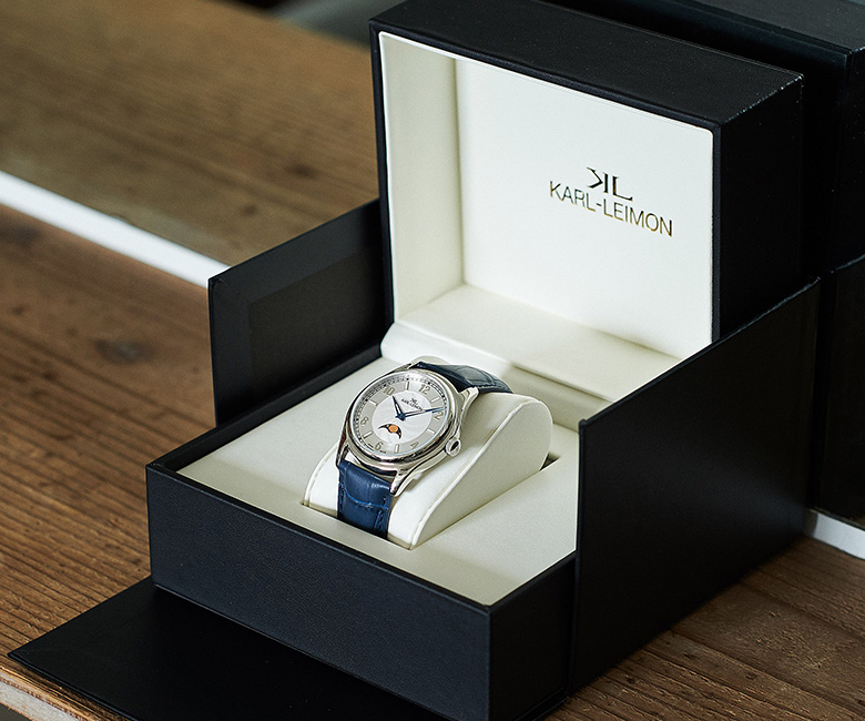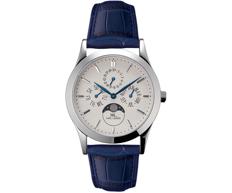 「クラシック シンプリシティ」ステンレスケース、38mm径、クオーツ、5気圧防水、ムーンフェイズ 3万1500円/カルレイモン info@karlleimonwatches.com現在のラインアップは、スタンダードな「クラシック シンプリシティ」とフルカレンダーを装備した「クラシック パイオニア」の2種類を揃える。
