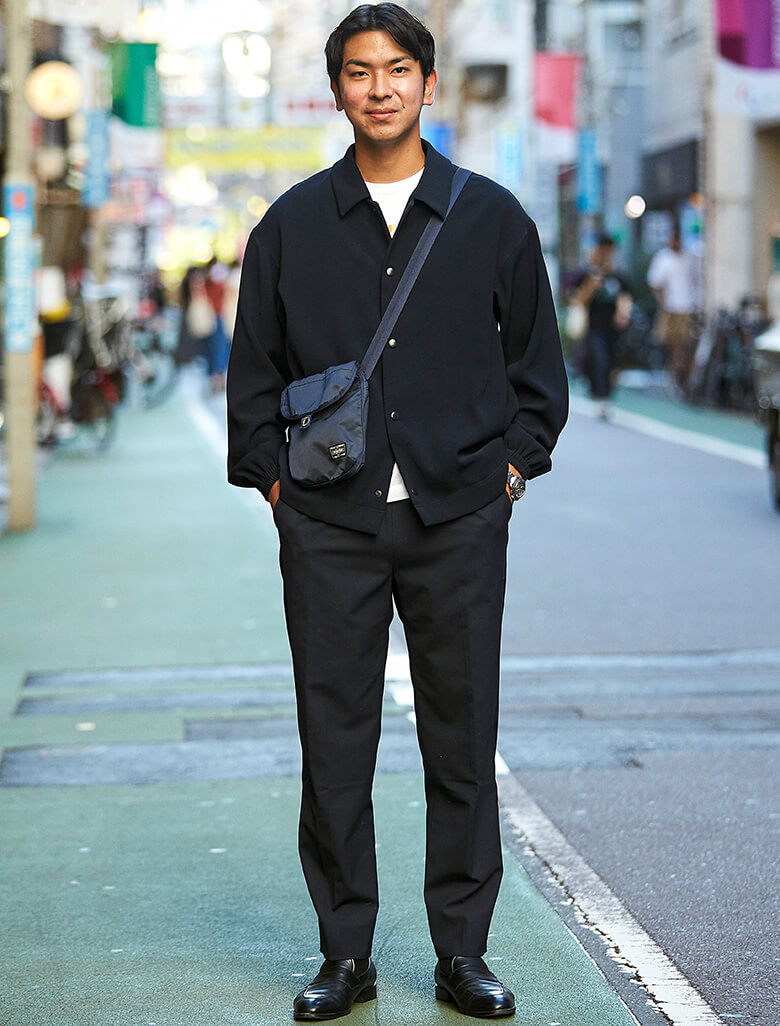 シャツ/ユナイテッドアローズ&サンズ バイ ダイスケ オバナ、インナー/ナイキ、パンツ、靴/ユナイテッドアローズ、バッグ/ポーター遠藤謙太さん(29歳)ブラックシャツの着こなし好例を見せてくれた遠藤さん。ともすると重たーいな印象になるところを、肩が落ちたシャツのシルエットで見事に回避。程よく肩の力が“ヌケ”た大人カジュアルに仕上げている。