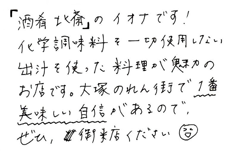 誤字をぐしゃっと消すのは気にしないタイプでした。 【取材協力】酒肴 北斎 和の仕事馬住所:東京都豊島区北大塚2-28-2 呑食ちょうちん横丁 大塚のれん街電話番号:03-5980-7372https://a687142.gorp.jp「看板娘という名の愉悦」Vol.126好きな酒を置いている。食事がことごとく美味しい。雰囲気が良くて落ち着く。行きつけの飲み屋を決める理由はさまざま。しかし、なかには店で働く「看板娘」目当てに通い詰めるパターンもある。もともと、当連載は酒を通して人を探求するドキュメンタリー。店主のセンスも色濃く反映される「看板娘」は、探求対象としてピッタリかもしれない。