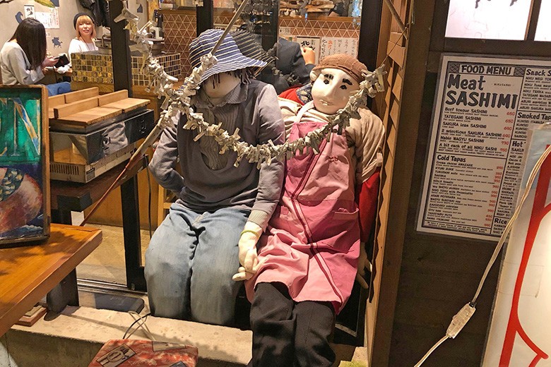 神妙な顔で褒められるイオナさん。なお、のれん街ではイオナさんの専攻テーマでもある地域のPRも意識している。例えば、「北斎」の店頭に座る案山子は高知の「天空の村・かかしの里」から取り寄せた“実物”。のれん街全体には10体もいる。