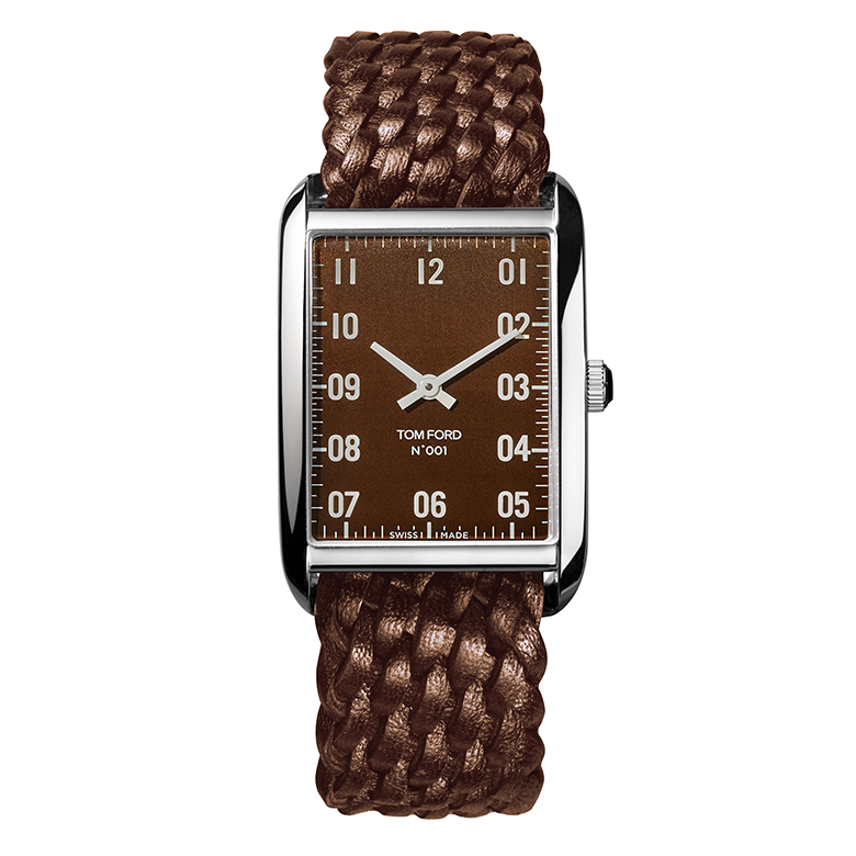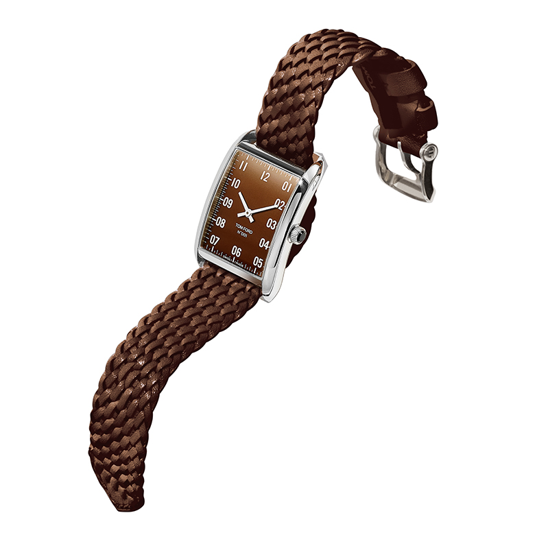 「N.001 ブラウンダイヤル」22万円、「ブレイデッド カーフ ストラップ」5万円/ともにトム フォード タイムピース エクスクルーシブ フォー ロンハーマン(ロンハーマン 0120-008-752)ご存知、トム フォードの時計コレクションでフラッグシップ的ポジションにある「N.001」。こちらはそこにロンハーマンの粋な遊びゴコロとオリジナリティ溢れるアレンジが加えられたエクスクルーシブモデルである。
