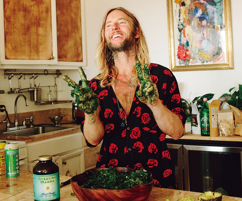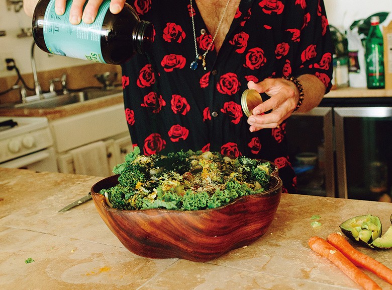そんな彼のケールサラダレシピは以下のとおり。材料は、グリーンケールのほか、アボカド、人参、ナッツ、海苔、塩、カイエンペッパー、オリーブオイル、セサミオイル。作り方は、それらを和えるだけだ。