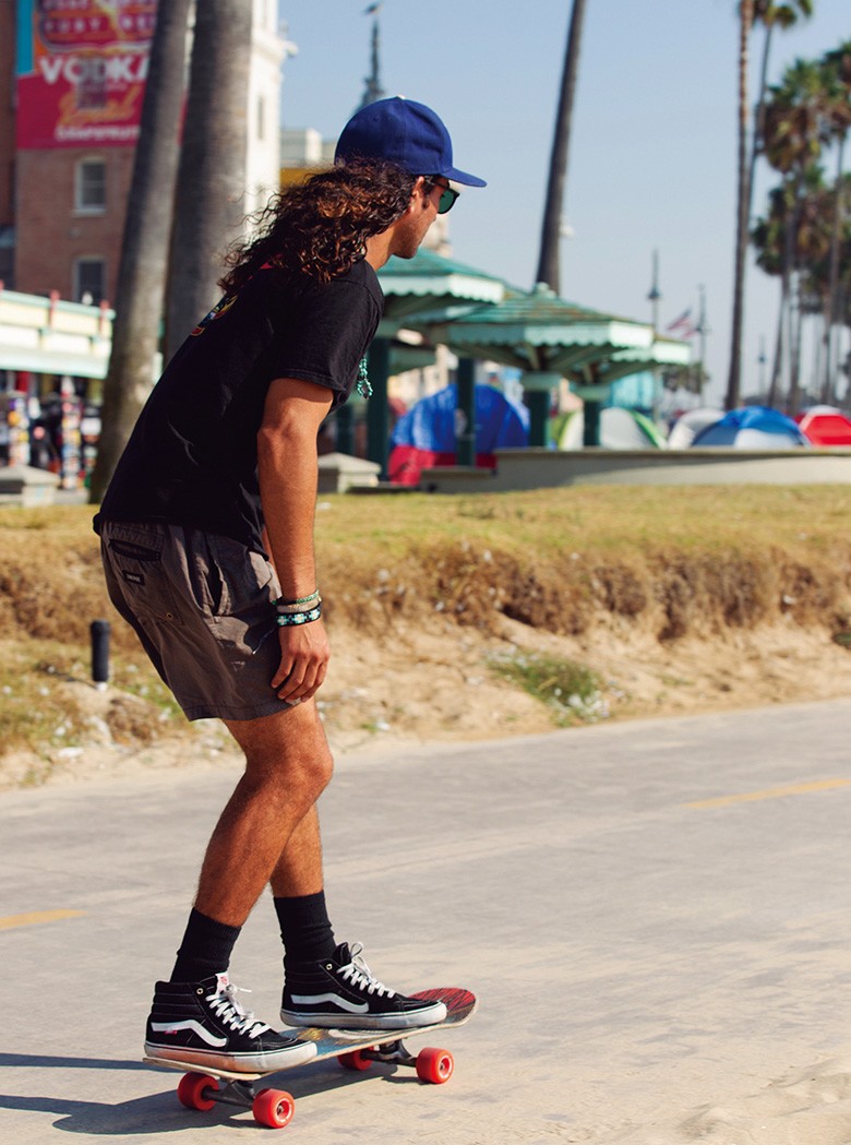 ビーチの近くに住むジョンもご多分に洩れず、近場の移動はもっぱらスケートボード。