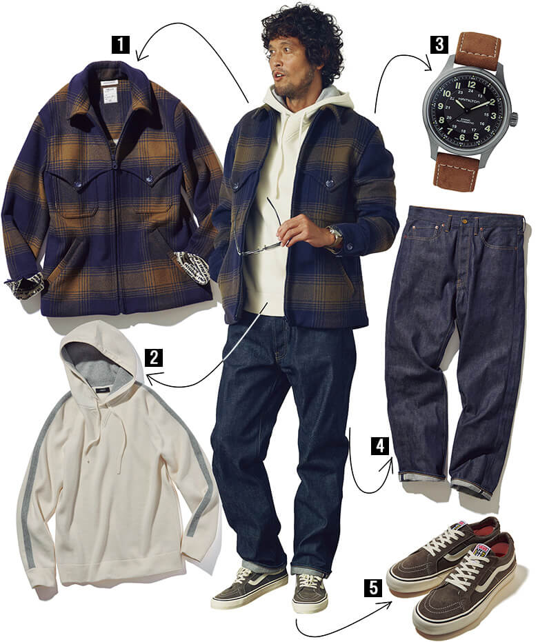 [5]「ヴァンズ」のスニーカーカーキスエードの渋色アッパーで仕上げた「オールドスクール」。靴&デニムは、トップのブルゾンと色合わせして統一感を出しているのがポイント。7500円/ヴァンズ ジャパン 03-3476-5624