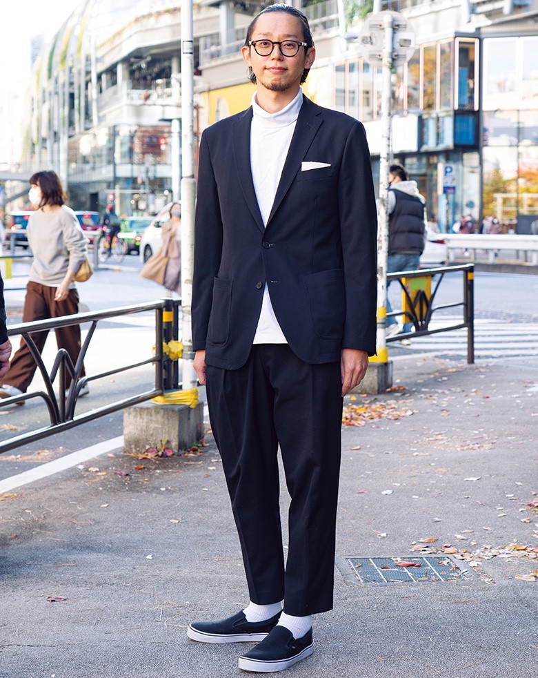 肩肘張らない、週末ドレスアップ。胸のチーフにインナー、ソックスと、白黒交互のリズムが心地いい。セットアップでラフさを出す一番の手段はパンツを短めに、と教えてくれた。