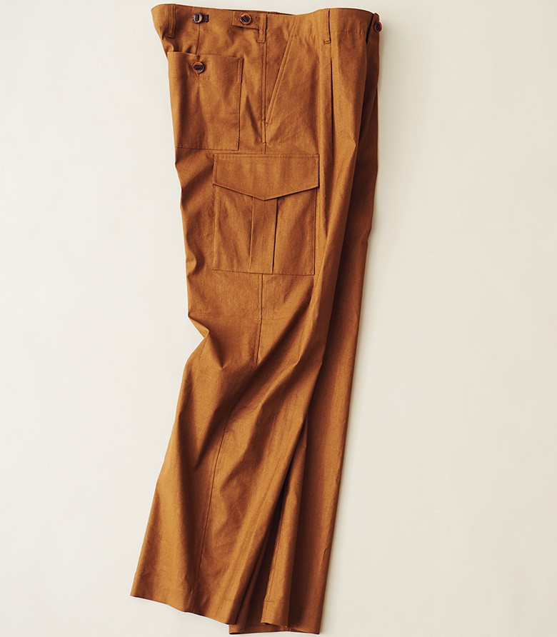 リネンとコットンを混紡し、シャリ感のあるはき心地を実現したカーゴパンツ。ジャケットスタイルにも活用できるエレガントな一本だ。3万円 [4月発売予定]/ポール・スチュアート(ポール・スチュアート 青山本店 03-6384-5763)「昔の服は新しい、そう言い切っています(笑)。でも実のところ、いつだって古いもののなかに新しい発見があるんです。