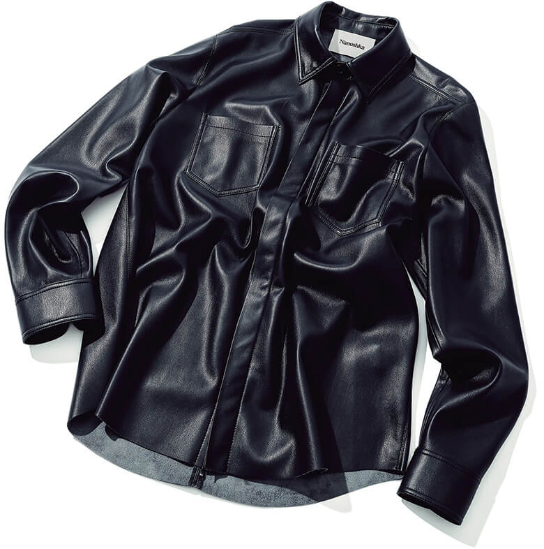 地球環境への配慮を主軸に置くブランドが作る、動物皮革を使わないヴィーガンレザーシャツ。柔らかな質感と、レザーにはない軽やかな素材感が注目の理由。5万2600円/ナヌーシュカ(ヒラオインク 03-5771-8809)推薦人