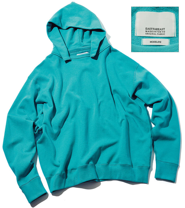 ヘビーな14オンスのオリジナル生地を使用。バインダーネックにフードを後付けしたヴィンテージ風デザインが目を引く。着やすいバルーンシルエット。2万円/イーストファーイースト info@eastfareast.tokyo推薦人