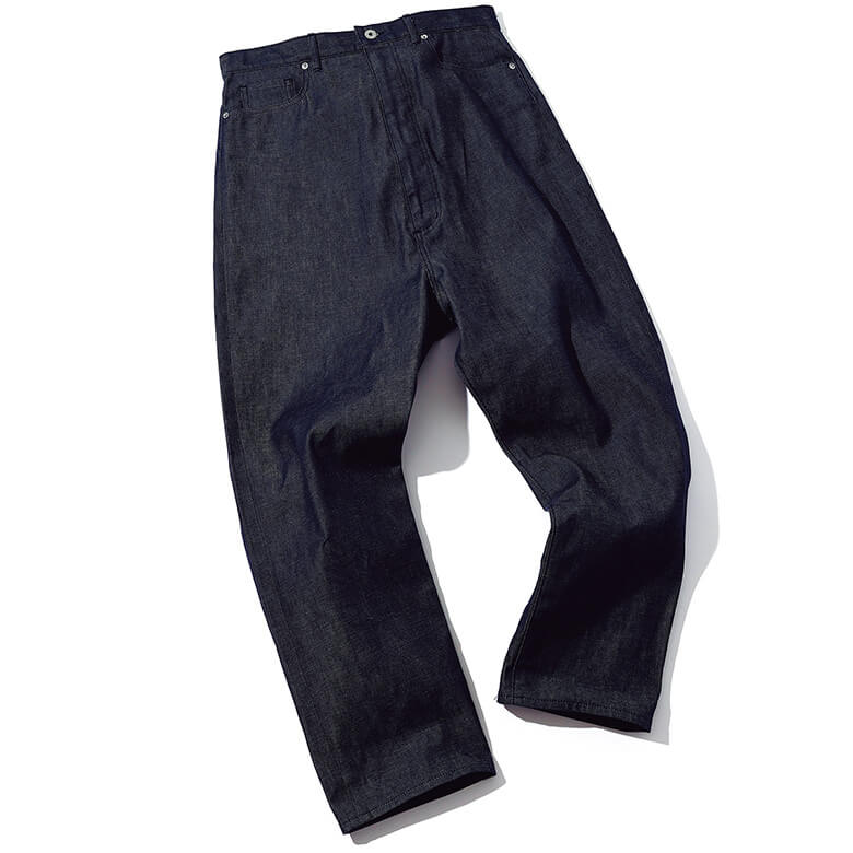 ノンフェイドで色落ちしないインディゴがソリッドな印象の5ポケットデニムを、ユニークなサルエルシルエットで仕上げた。3万9000円/マディソンブルー 03-6434-9133推薦人