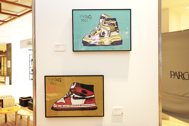ミラクルくんはスニーカーも大好き。この絵のモデルはもちろん、コンバースの「CONS ERX 400 HI」と、ナイキの「エア ジョーダン 1」だ。ミラクルくんの線画は下書きなしの一発描き。所要時間は1枚あたり3〜5分程度だというから驚きだ。
