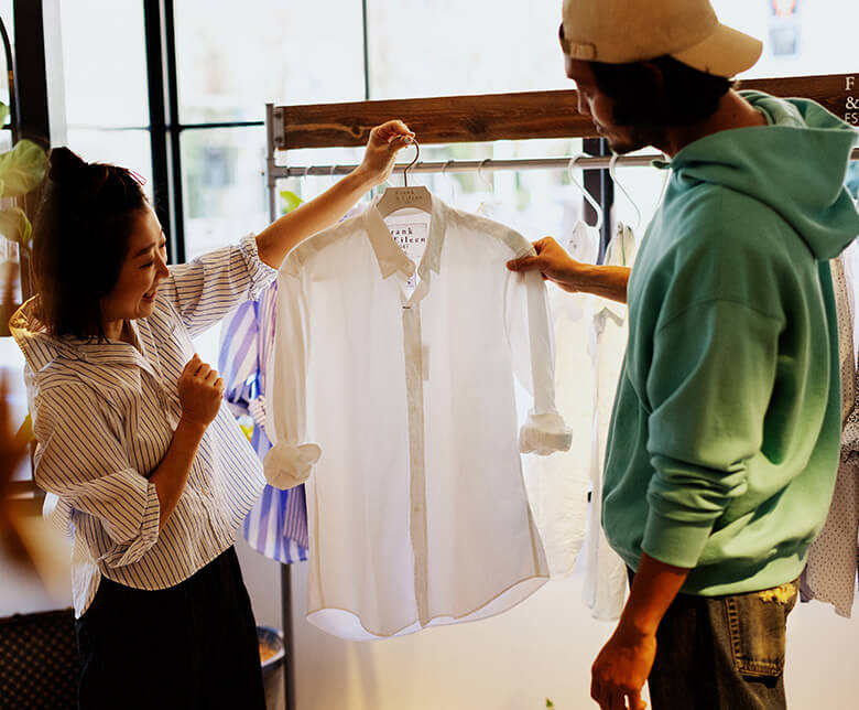 改めてシャツの魅力を知りたい、とマーシー自らフランク&アイリーンを訪問。ショップスタッフの大関真弓さんに話を聞くうちに、彼がシャツに惹かれる理由が明らかになってきた。
