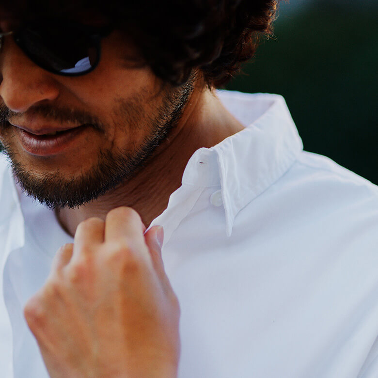 第2ボタンまでのピッチを短くし、ほどよい開襟の上品なシャツに仕上げている。「フィンバー」2万5000円/フランク&アイリーン(サザビーリーグ 03-5412-1937)大関 マーシーさん、それは“着丈”のおかげかもしれません。