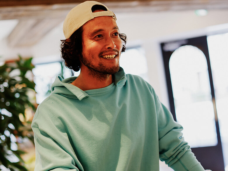 「僕もサーフィンするときは砂浜のゴミを拾うようにしているんですよ」とマーシー。環境にも人にも優しいシャツに、より親近感を抱いたようだ。マーシー ん、ピーコック……じゃないですよね?