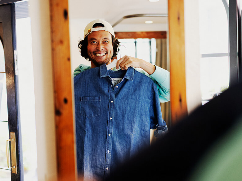 と、マーシーが選んだのはノーダメージのデニムシャツだ。大関 ルークの日本限定モデルです。通常ルークのデニムシャツは、色落ちやアタリなどリアルなダメージ加工を施しているのですが、あえて
