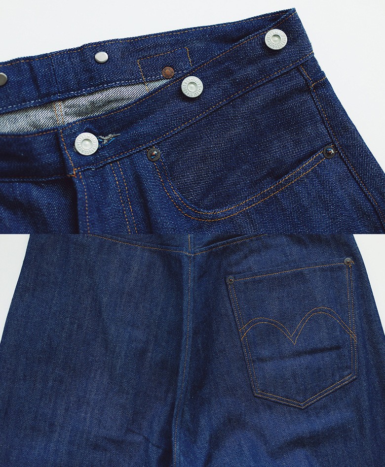 [上]サスペンダーに対応していた当時のワークウェアとしてのディテールを再現。[下]現代では両サイドに付くヒップポケットも、片方だけと当時の仕様に忠実。1890年当時の風合いを再現した、無地のセルビッジ付き9オンスデニムを使用。ヒップのワンポケットもこのモデルならでは。