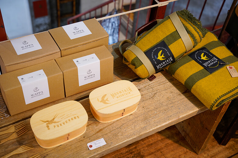 杉材で仕立てられたワッパの弁当箱。4620円、ジャカード織りのウールブランケットも。2万900円/ともにマウンテン・マウンテン(パーヴェイヤーズ 0277-32-3446)「マウンテン・マウンテン」はパーヴェイヤーズがディレクションするブランドで、「10年以上付き合えるアウトドアギア」がコンセプト。