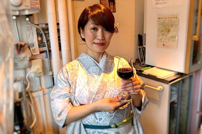 「着物の柄は蝶の羽です。赤ワインというお花に蝶が群がるイメージ。美味しいワインを目当てに皆さんが集まってくださる、このお店と重なるかなと思いまして」。