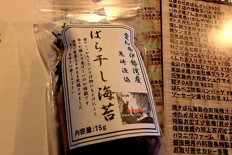 さて、フードはぜひ「特製おむすび」を食べたい。梅と高菜にしよう(各350円)。米は魚沼産のコシヒカリ。さらに、「焼きばら海苔のお味噌汁」(250円)も注文。これに1000円のチャージがかかるが、いずれにせよスナックとしてはかなり良心的な価格設定だ。