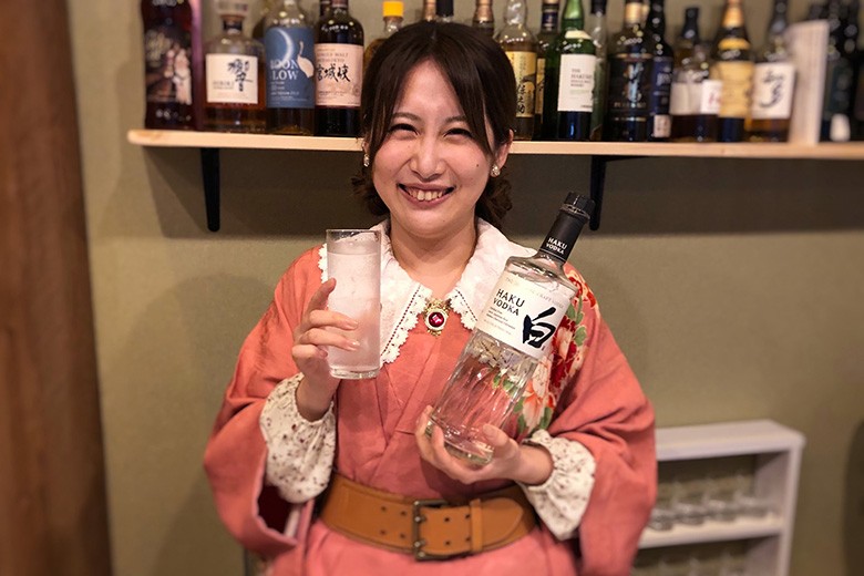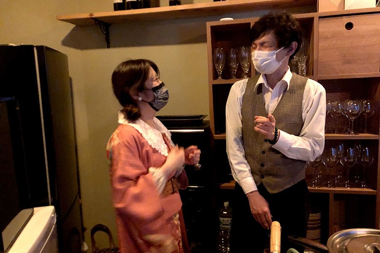 「お待たせしました〜」。こちらは、舞台役者の星 秀美さん(29歳)。店には女性経営者やエンタメ関係者が日替わりママとして立つ。
