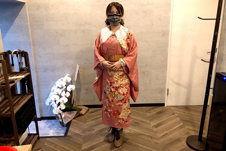 よく見るとアグレッシブなコーディネイト。「着物とベルトは演劇人フリマで買ったものです。たしか、それぞれ1000円ぐらい。今は3、4着持っています。これ、かわいいかなと思って。ピンクが好きなので。インナーは古着のブラウスで靴はしまむらなので、全身の総額は8000円とかです(笑)」。